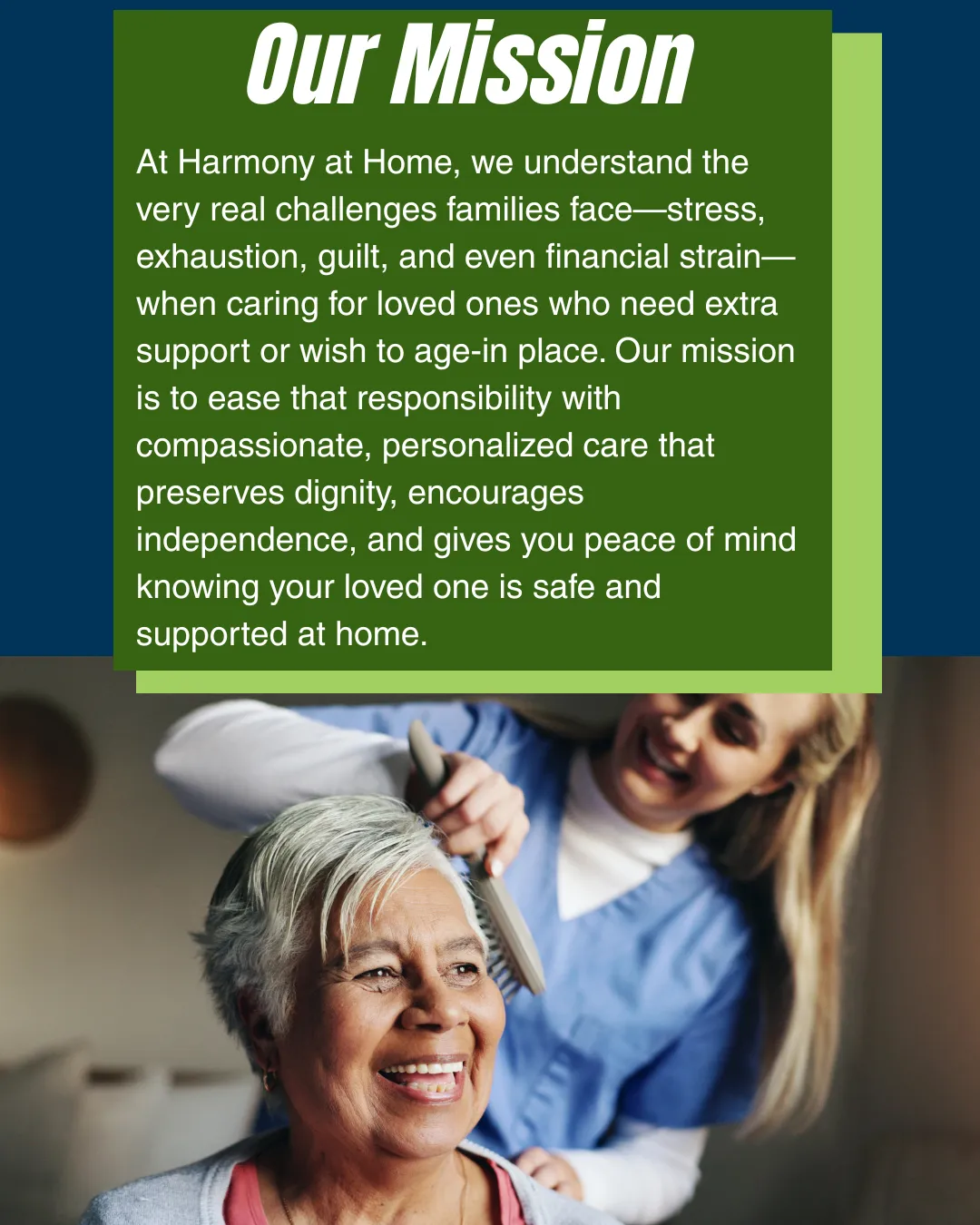 We provide ongoing support, flexible care plan updates, and compassionate, reliable care for your loved one. With Harmony at Home, your loved one is always in caring and capable hands.